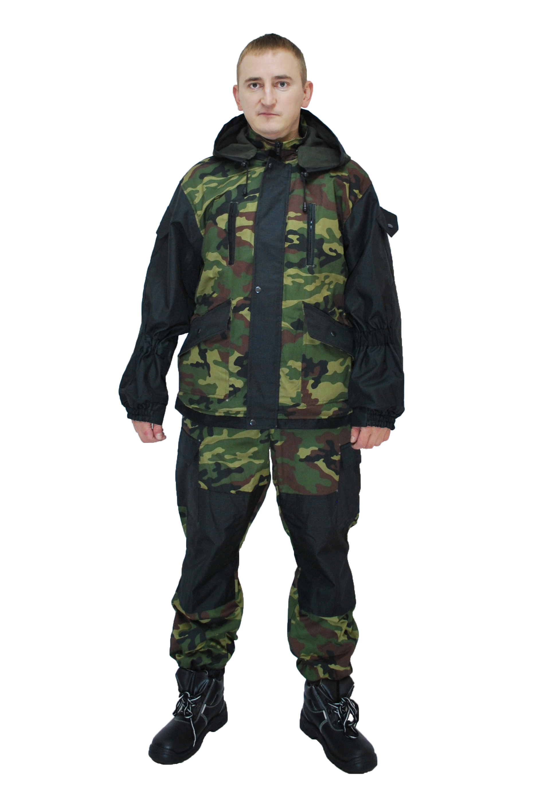 Куртка, брюки. Регулируемый капюшон с козырьком. Центральная застежка на пуговицы в застегнутом виде находится внутри ветрозащитной планки. Два боковых кармана с клапанами на пуговицах. Верхняя часть кармана при закрытии загибается вместе с клапаном. На локтях дополнительное усиление из ткани грета. На монжетах рукавов вставлена резинка. Утяжка понизу куртки из шнура с фиксатором. Брюки имеют отстегивающееся подтяжки из широкой резинки (50мм), брюки с широким поясом на резинке с шлевками под ремень шириной до 5 см, два прорезных кармана с боку, два обьемных накладных кармана на бедрах, резинка в области голени для лучшего прилегания к ноге, в области колена дополнительное усиление.