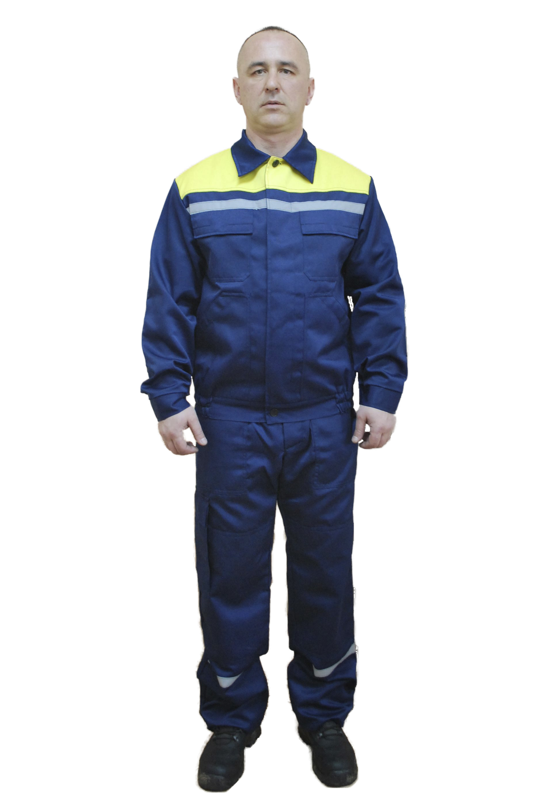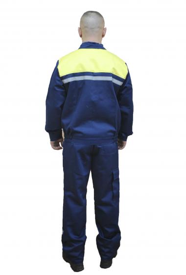 Куртка укороченная, с регулировкой низа, центральная потайная застежка на пуговицах, карманы нагрудные с клапанами и нижние накладные, СВ полосы, усилительные накладки в области локтей, манжеты на пуговицах.