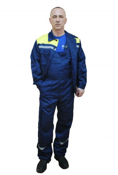 Полукомбинезон, регулировка по талии эластичной лентой,  с накладными и боковыми карманами, усилительные накладки в области коленей, СВ полосы по низу п/к.