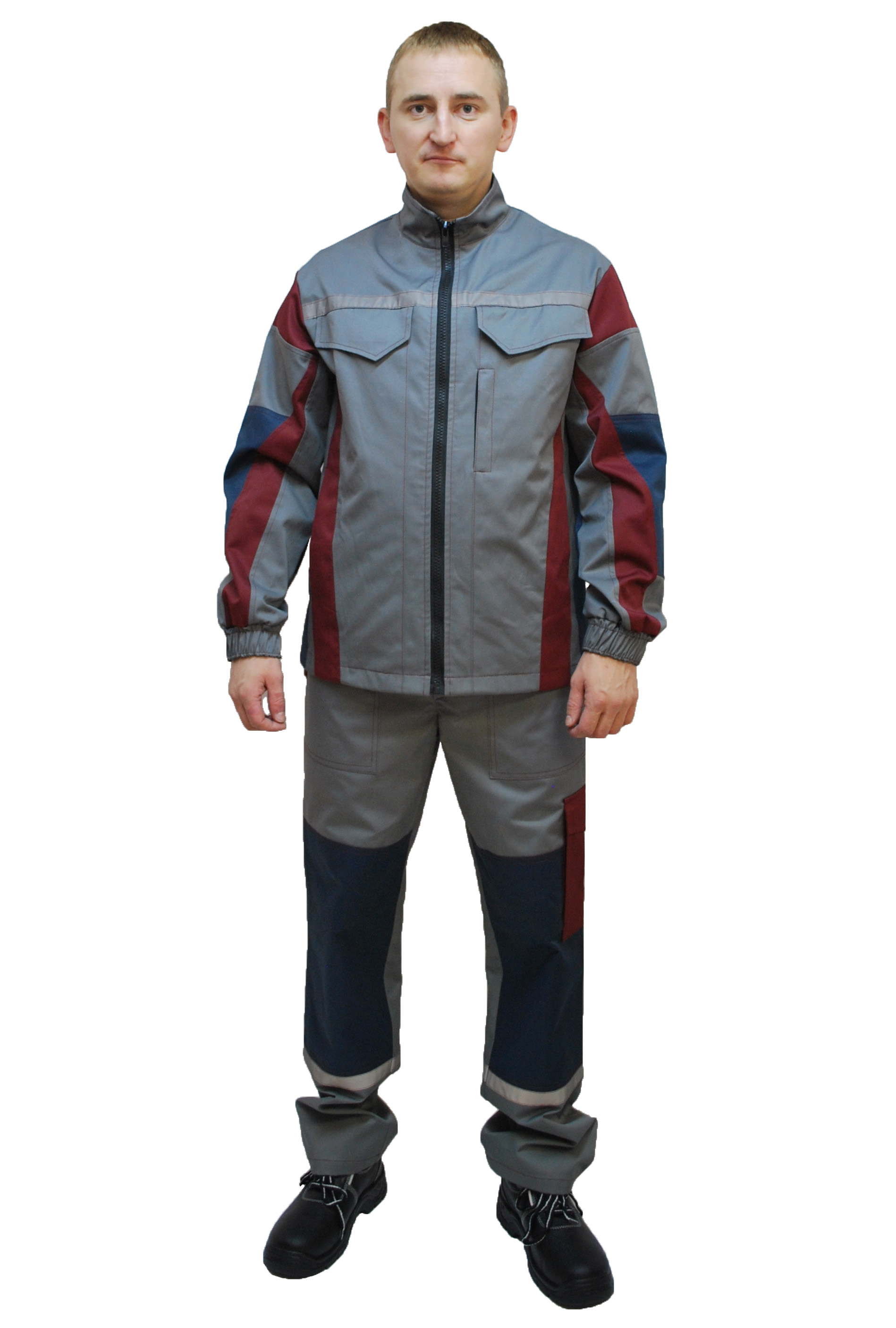 Куртка: центральная застежка на пуговицы, накладные карманы, СВ полосы, усилительные накладки в области локтей, манжеты на пуговицах.