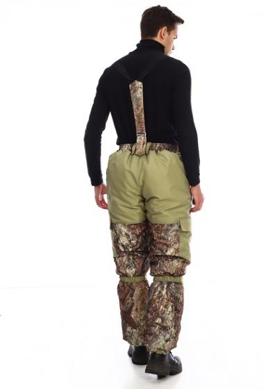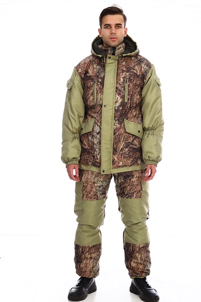 Куртка, брюки. Куртка удлиненная с центральной застежкой на тракторной молнии, ветрозащитная планка на кнопках. Два боковых кармана с клапанами на кнопках, два грудных на молнии. На локтях дополнительное усиление, имеются карманы на кнопках. Брюки с широким поясом на резинке, два прорезных кармана с боку и два накладных. В области коленей дополнительное усиление. Эластичная тесьма в области колен и локтей.