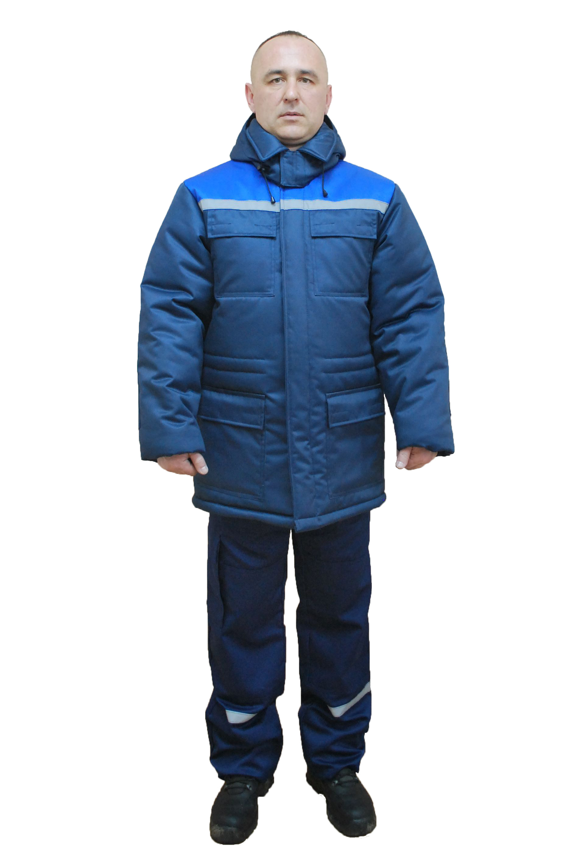 Куртка: съёмный капюшон на пуговицах, потайная застёжка на пуговицах, СВ полосы, регулировка объёма потайной кулисой, усилительные накладки в области локтей, накладные карманы с клапанами на липучках.